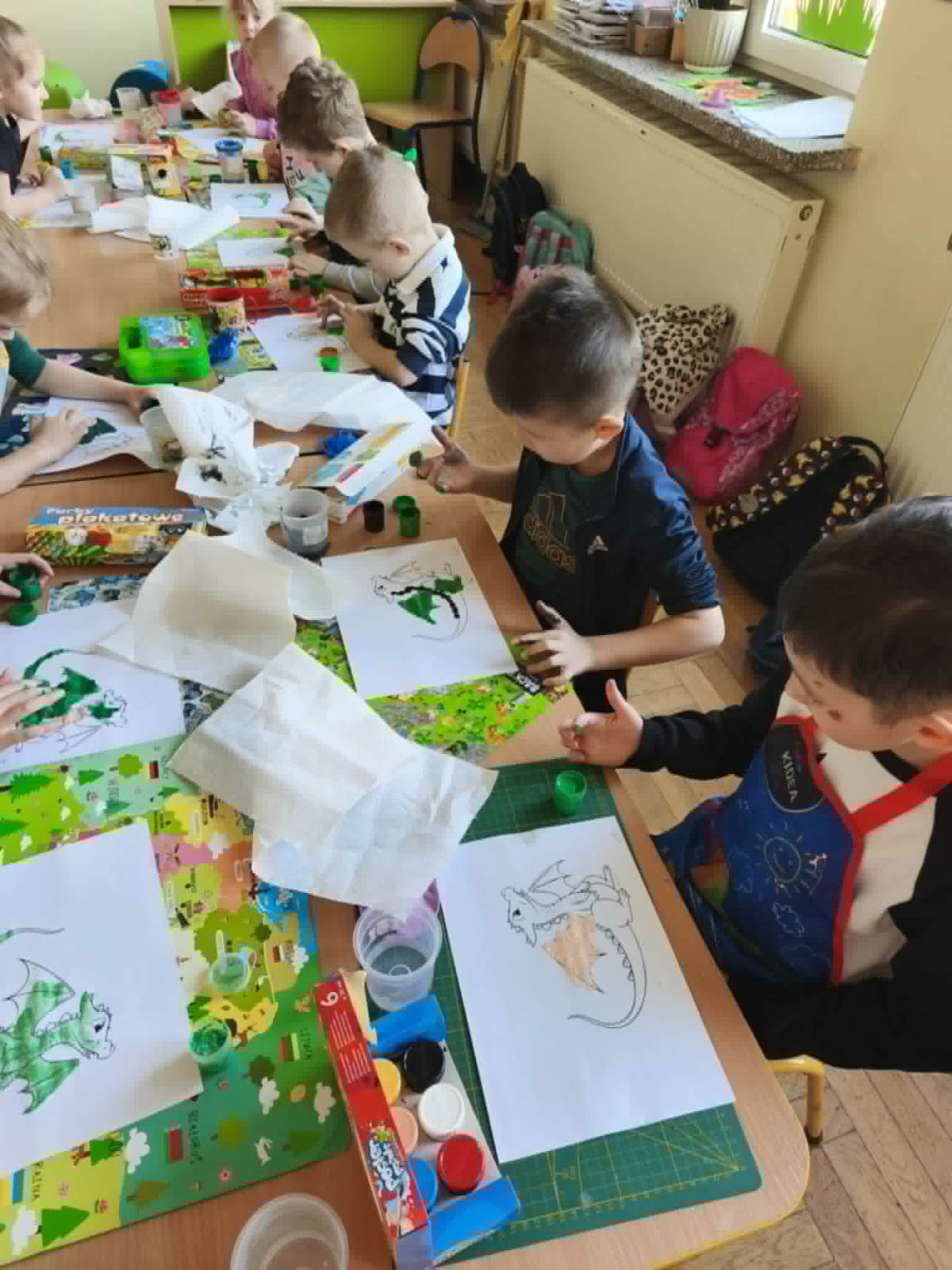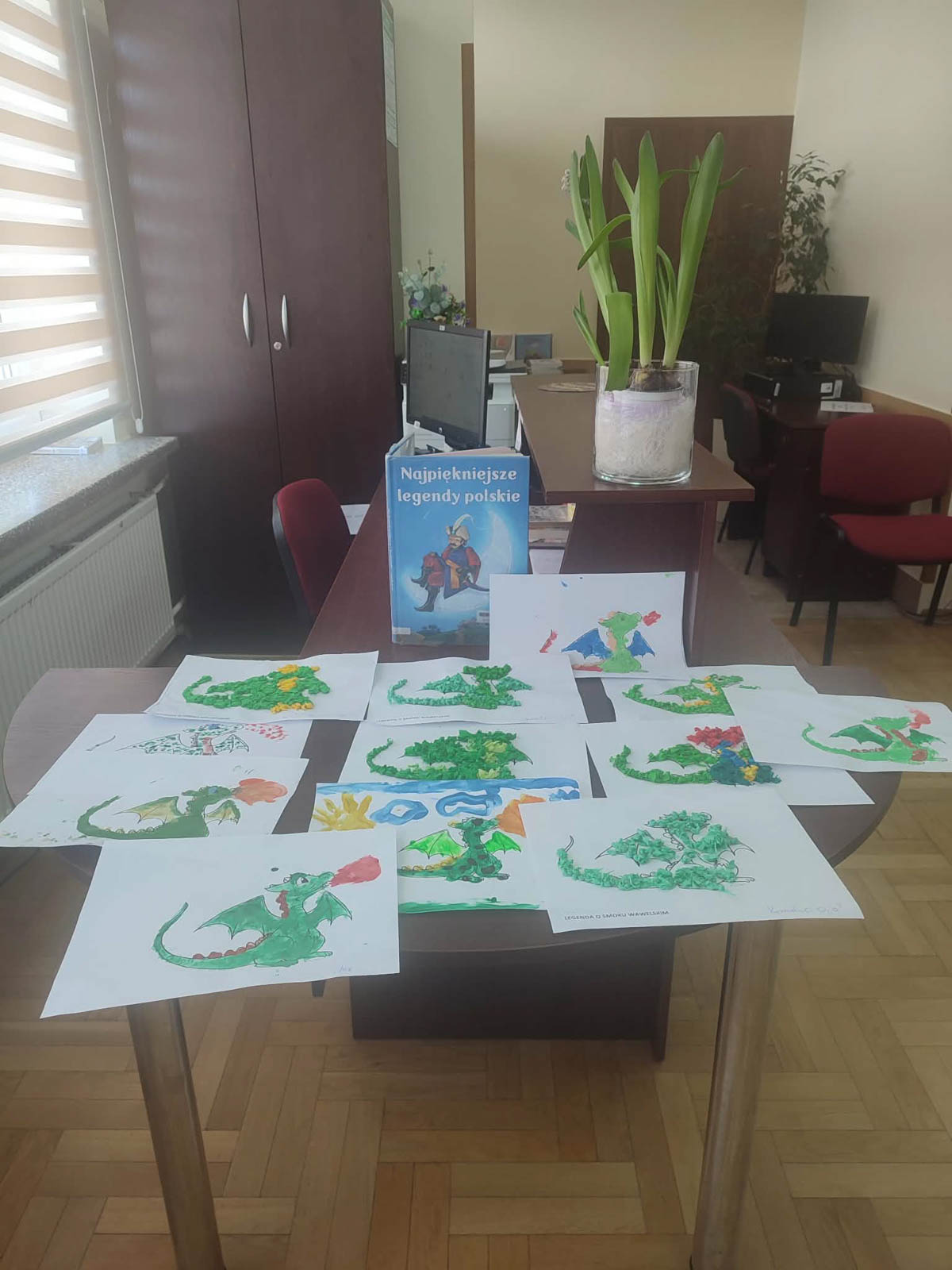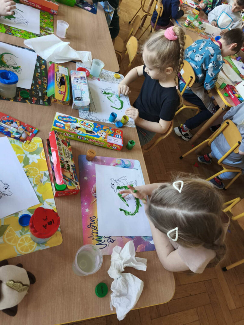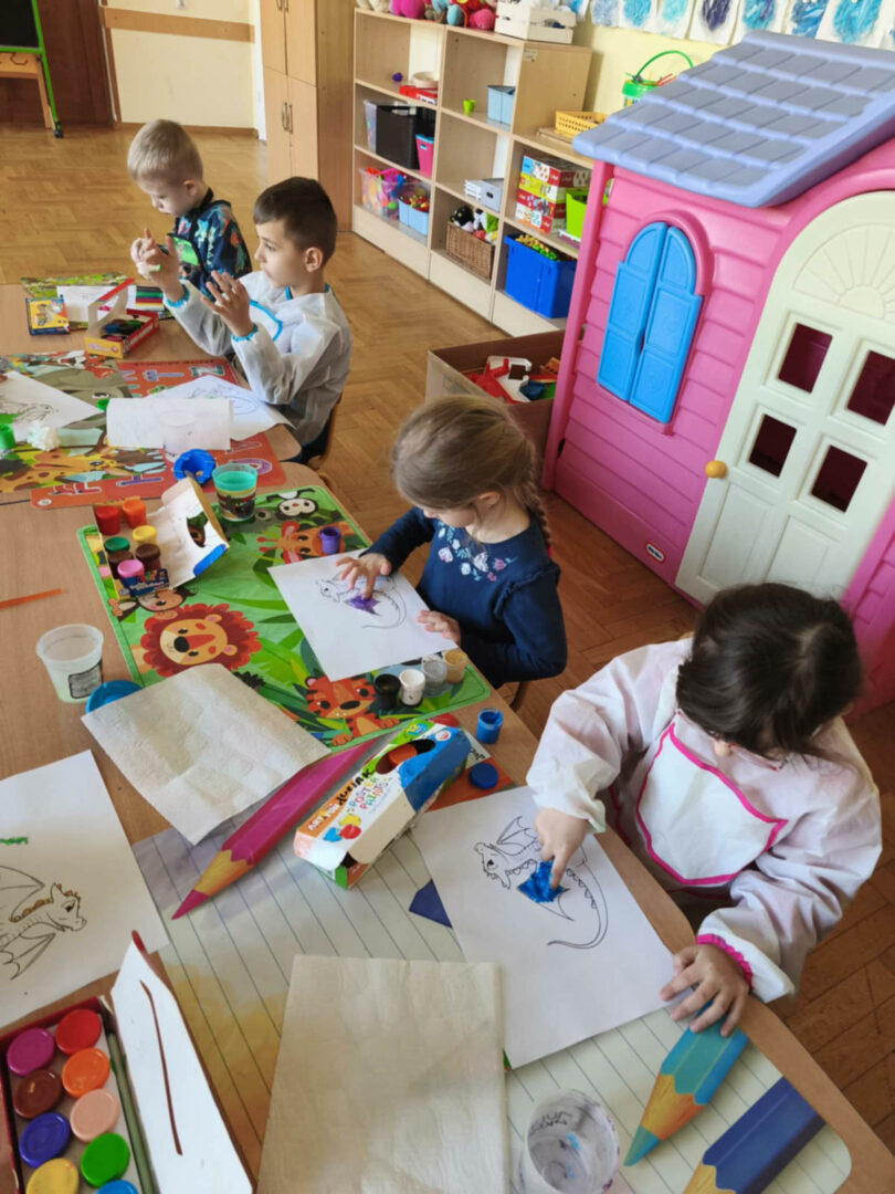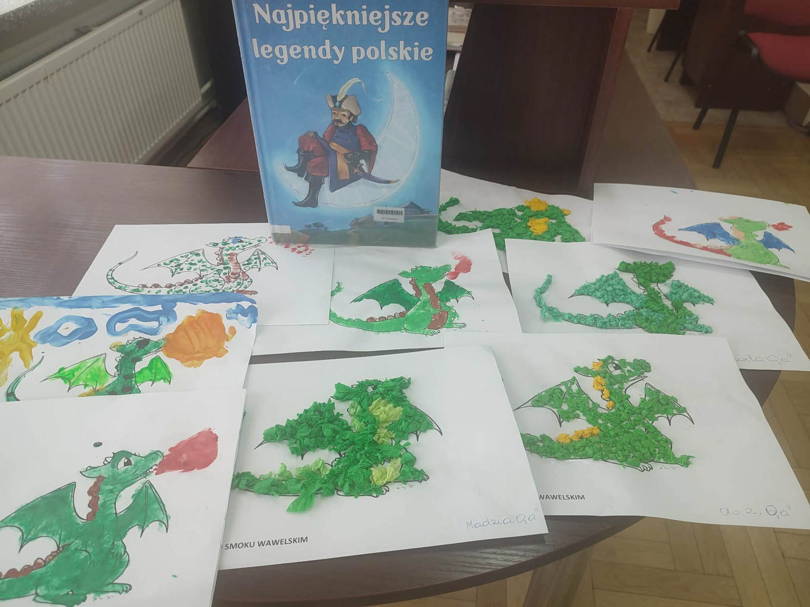 Legenda ta opowiada o dzielnym Szewczyku,który dzięki mądrości i odwadze przechytrzył i pokonał smoka, który od lat nękał Krakowian i pustoszył ich domostwa.Dzięki temu wyczynowi zaskarbił sobie wdzięczność króla oraz rękę królewny Wandy.Na zakończenie nie zabrakło też stałego elementu naszych warsztatów.Dzieci wykazały się kreatywnością, tworząc barwne prace plastyczne przedstawiające Smoka Wawelskiego.